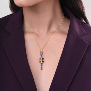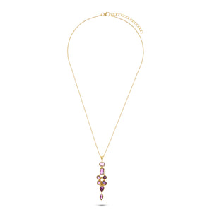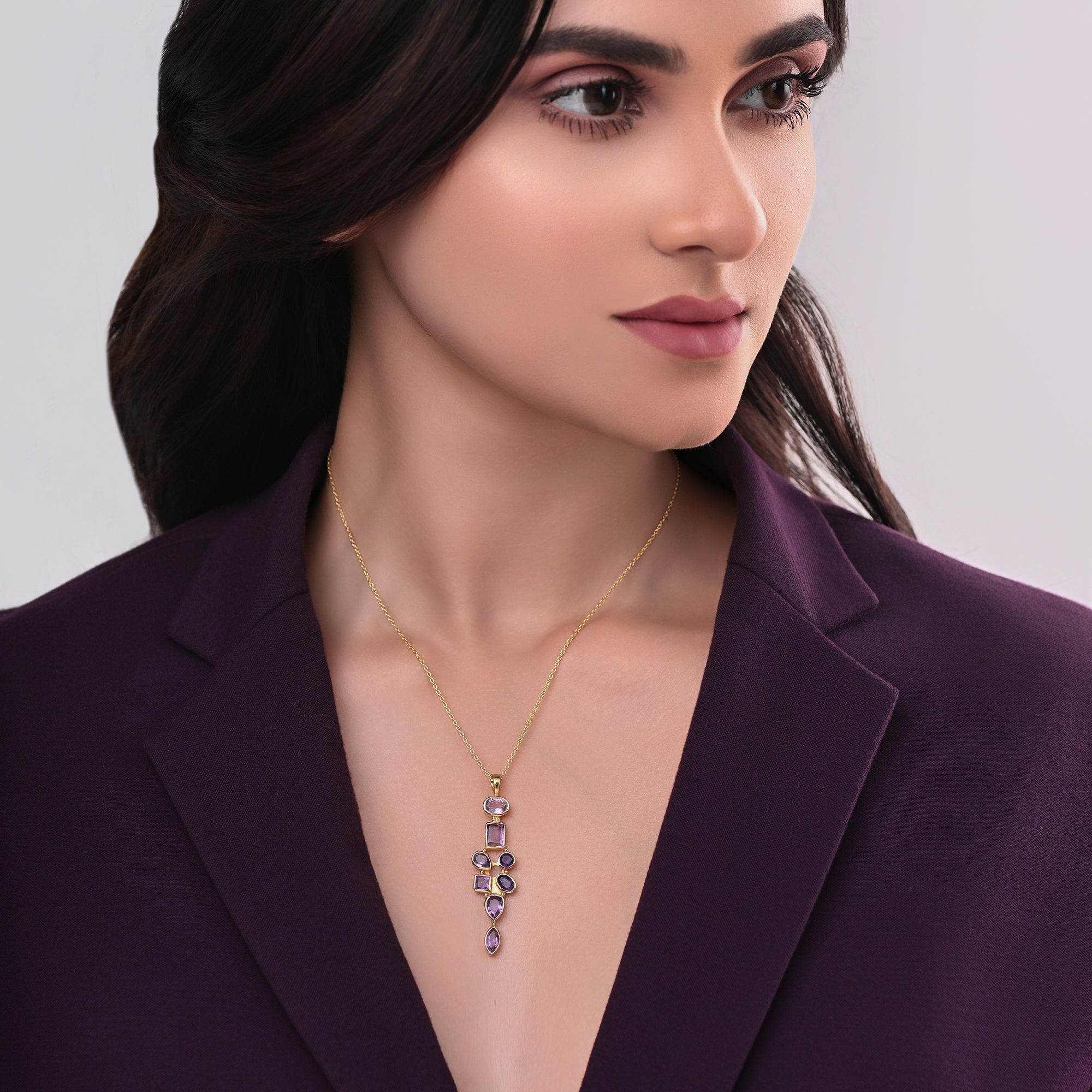 A luxurious drop of elegance, this pendant showcases a stunning arrangement of amethyst gemstones in multiple cuts — oval, pear, and emerald — all set in gold-plated 925 sterling silver.
